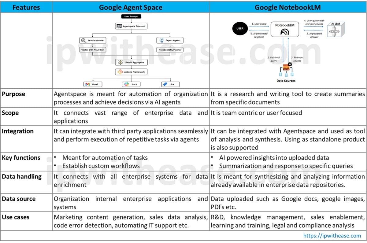 | Integration | It can integrate with third party applications seamlessly and perform execution of repetitive tasks via agents | It can be integrated with Agentspace and used as tool of analysis and synthesis. Using as standalone product is also supported |