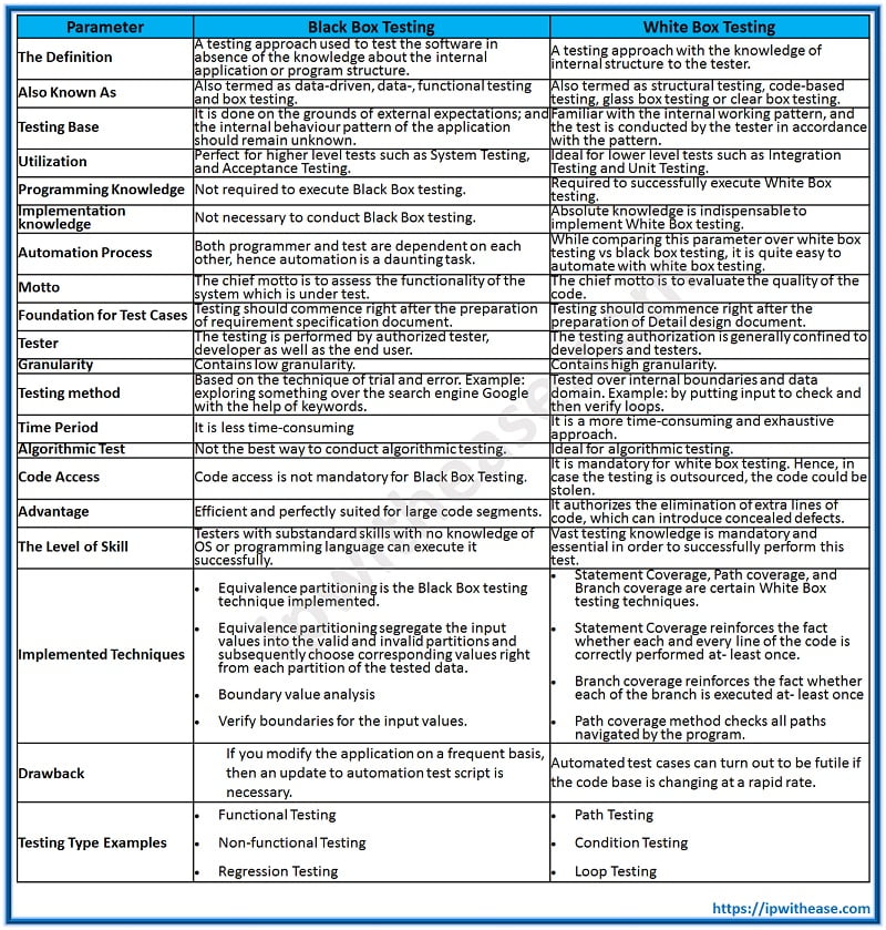 | Implemented Techniques | 1) Equivalence partitioning is the Black Box testing technique implemented. 2) Equivalence partitioning segregate the input values into the valid and invalid partitions and subsequently choose corresponding values right from each partition of the tested data. 3) Boundary value analysis 4) Verify boundaries for the input values. | 1) Statement Coverage, Path coverage, and Branch coverage are certain White Box testing techniques. 2) Statement Coverage reinforces the fact whether each and every line of the code is correctly performed at- least once. 3) Branch coverage reinforces the fact whether each of the branch is executed at- least once 4) Path coverage method checks all paths navigated by the program. |